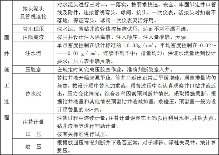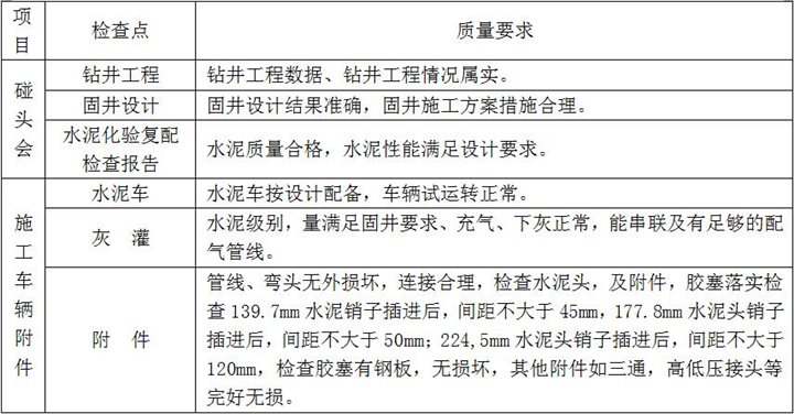 2、固井施工:按設(shè)計注入隔離液,水泥漿壓膠塞,頂替鉆井液、碰壓、試壓完成、固井施工過程檢查點項及要求如下: